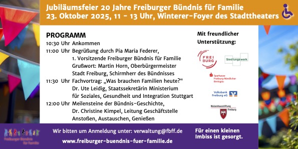 Begrüßen wird Sie unsere 1. Vorsitzende Frau Pia Maria Federer sowie der Oberbürgermeister Herr Martin W. Horn. Im Rahmen der Feier erwartet Sie unter anderem ein Fachvortrag zum Thema „Was brauchen Familien heute“ sowie ein Einblick in die Geschichte unseres Bündnisses.